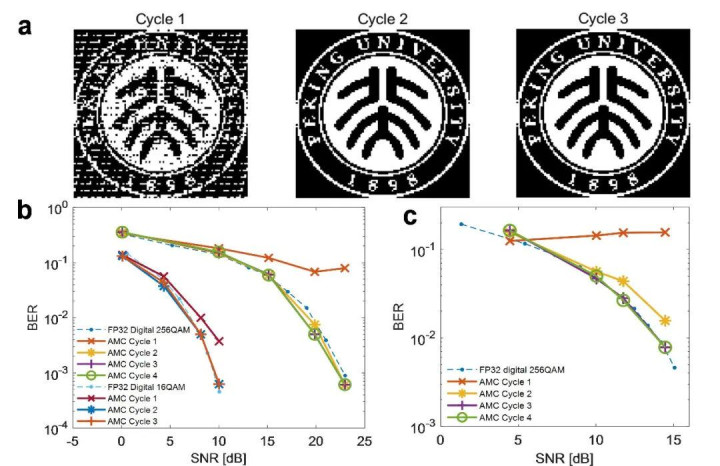 在应用验证层面,该方法被成功应用于大规模多输入多输出(MIMO)系统的信号检测任务。研究团队展示了基于迫零检测的图像恢复效果,在第二个迭代周期内,接收图像即与原始图像达到高度一致。进一步的误码率-信噪比分析显示,仅需三次迭代,该系统在无线通信场景下的检测性能即可媲美32位浮点精度数字处理器(图4),凸显出其在实时信号处理中的潜力。