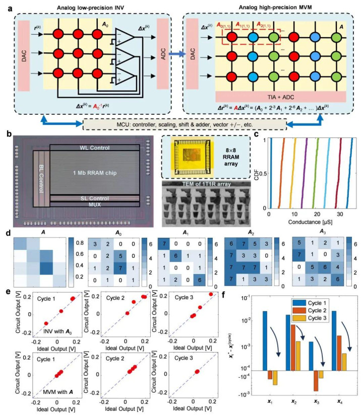 此外,模拟低精度矩阵求逆和模拟高精度矩阵-向量乘法运算两个电路的阻变存储器阵列在40nmCMOS工艺平台制造,可实现3比特电导态编程。