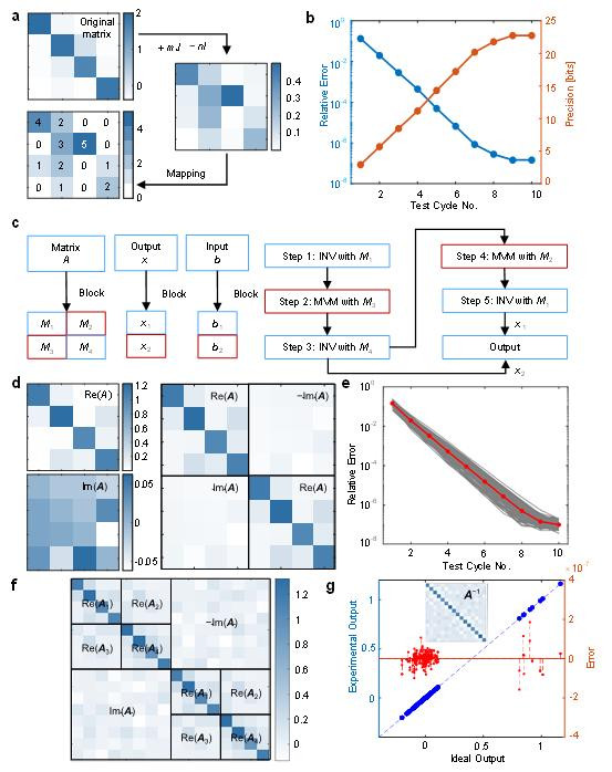 通过与块矩阵算法相结合,我们在实验上成功实现了16×16矩阵的24比特定点数精度求逆(图3)。具体而言,矩阵方程求解经过10次迭代后,相对误差可低至10⁻⁷量级,展现了该方案在计算精度上的显著优势。