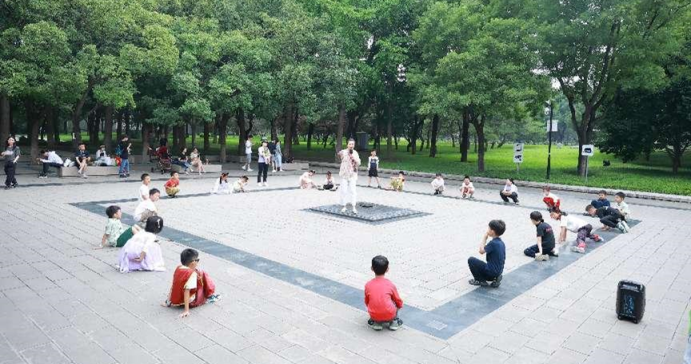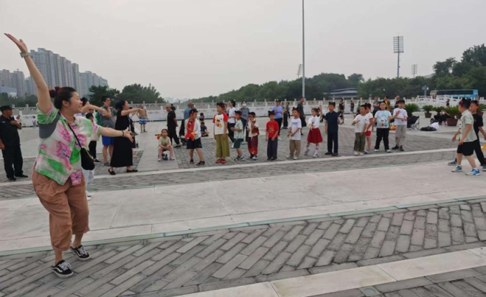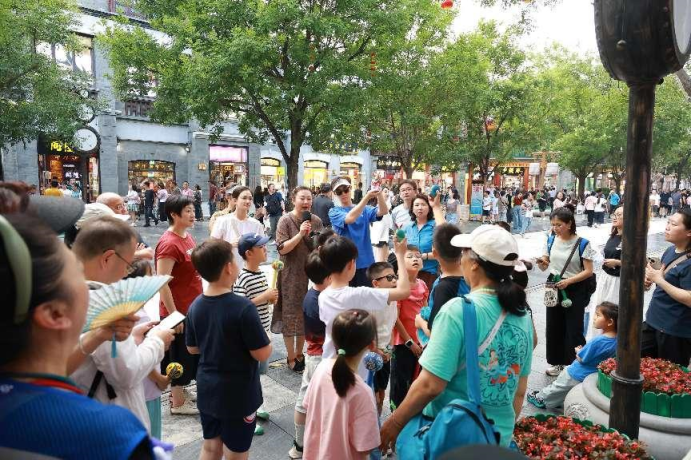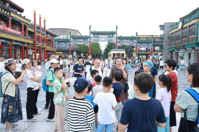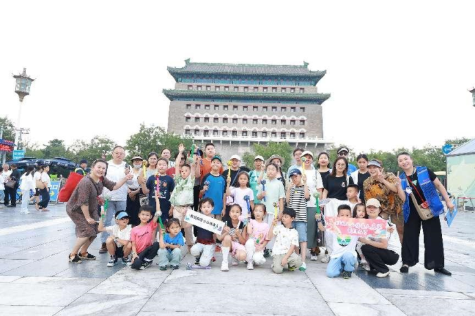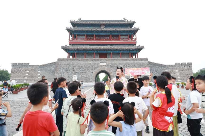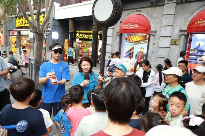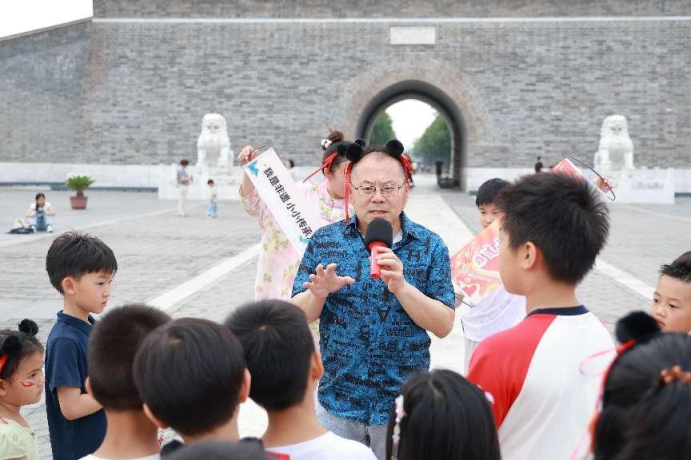 6月29日,小朋友们在前门五排楼前集合,听京城非遗协会会长杨建业讲述了“十五的兔儿爷上前门”的传说。
