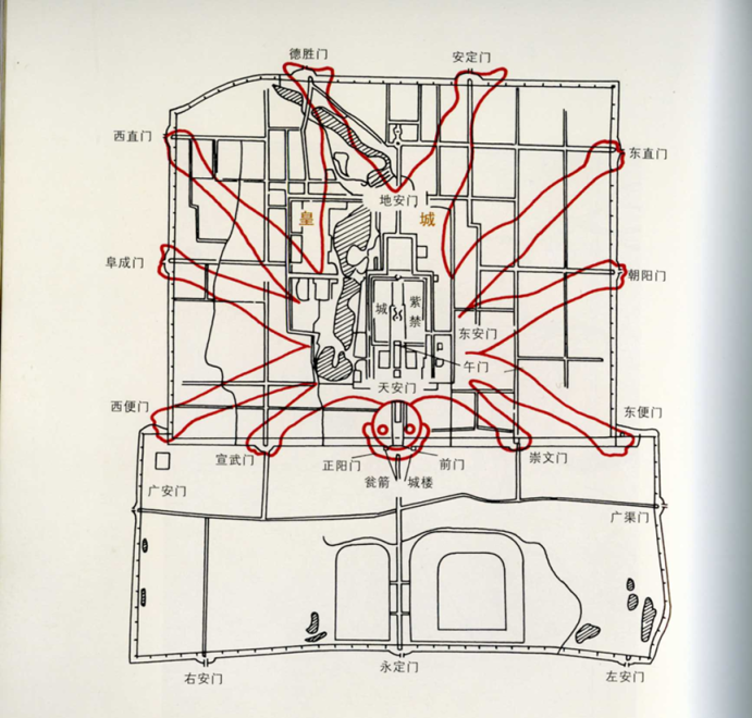 “大都周遭十一门,草苫土筑那吒城。讖言若以砖石裹,长似天王衣甲兵。”相传当年朱棣的军师刘伯温和姚广孝就是按照哪吒的样子,勾画出了北京城。中轴线上的正阳门就来自哪吒头部最核心的部位。“八臂哪吒城”的传说,随着北京城的不断延绵发展,世世代代在北京人中心口相传,成为北京中轴线传说中流传最广的一个。
