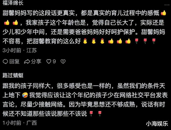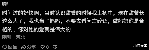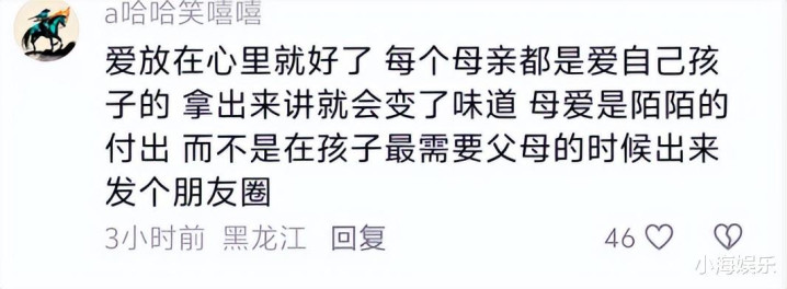 当然,也有网友劝李小璐,应该把爱放在心里就行了,每一个母亲都是爱自己孩子的,拿出来讲就有些变味道了。母爱是摸摸地付出,并非是在孩子最需要父母时发个朋友圈。当然,还有网友在评论区提及李小璐往事,冷嘲热讽。李小璐对这些言论早已看淡,不会理会。