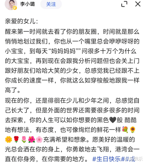 文中,李小璐称一醒来就去看女儿的朋友圈,感慨时间过得快,回忆甜馨从一个嘴里总是咿咿呀呀的小宝贝,到每天问自己十万个为什么的大宝宝,再到后来会跟自己分析问题,会和好朋友哈哈大笑的少女。李小璐直言自己已经跟不上女儿成长的速度了。直言怎么就突然长的跟自己一样高了。