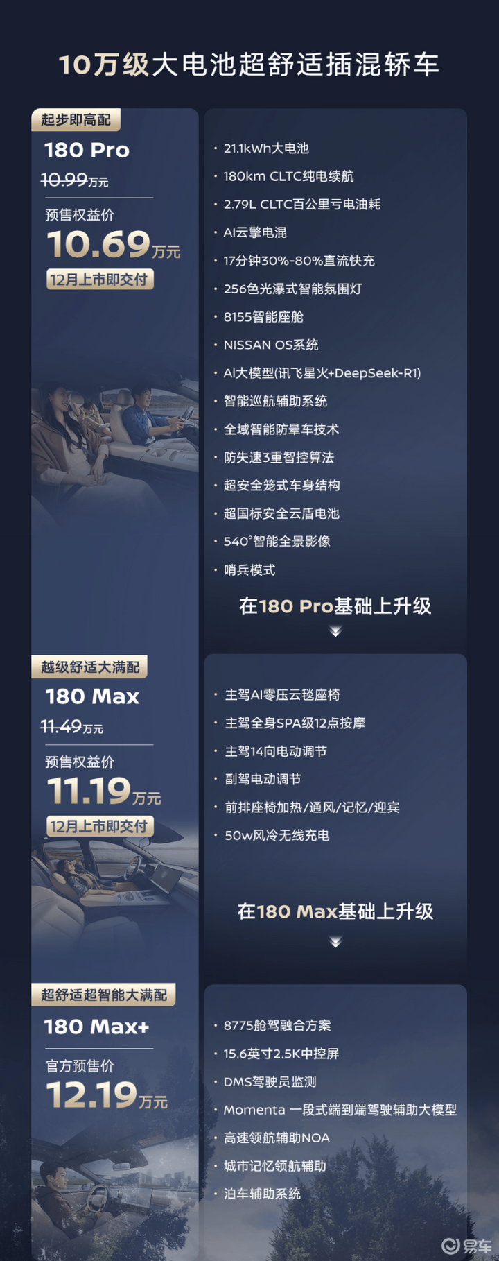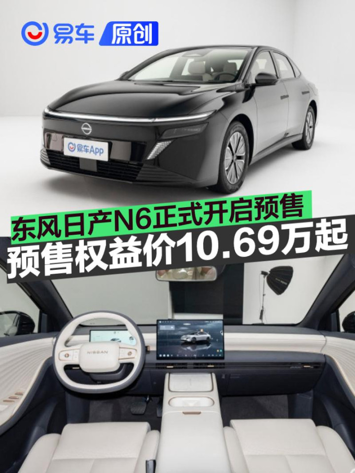 易车讯11月13日,东风日产N6正式开启预售,共推出3款车型,预售价10.99-12.19万元,入门及中配车型推出预售权益价,限时预售价10.69-11.19万元。新车外观延续家族式设计,同时是天演架构下首款插混轿车,搭载1.5L插电混动系统,纯电续航里程180km。官方表示,新车是与N7技术同源的“插混版N7”,将于12月8日正式上市。